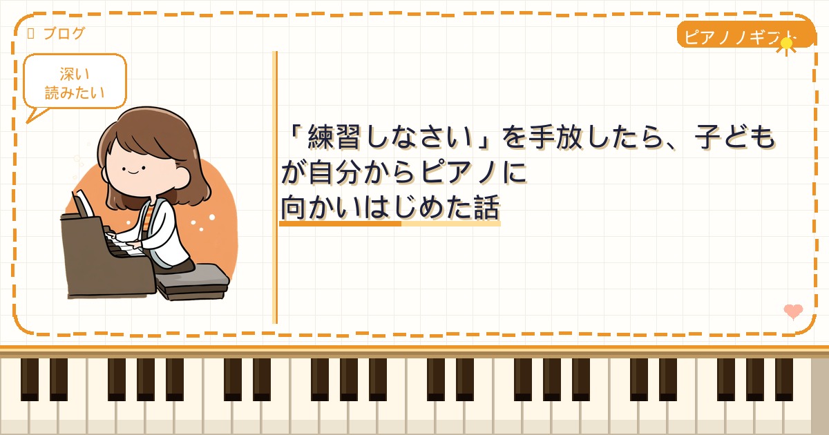 「しなさい」「イヤ」のやりとりがなくなるだけで、ピアノの話題がケンカの種ではなくなる。お子さんがピアノのそばを通るとき、ちょっとフタに手を置いてみる。気まぐれに一音だけ鳴らしてみる。——そういう小さな変化が、ある日「自分から弾いてみようかな」に変わる瞬間が来ます。